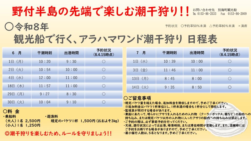 ご予約、お問い合わせは別海町観光船へお願いします。